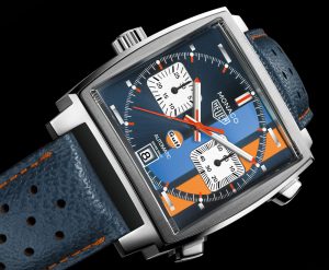 The brand’s subtle change from the standard Monaco’s red chronograph hands to Gulf orange versions also works well to create a cohesive feel for the dial overall. The rest of the dial design is strikingly pared-back, with the Gulf logo rendered for the first time in simple white and integrated into the minimal 6 o’clock running seconds subdial.